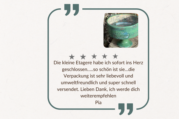 Und deshalb ist es mir wichtig, mich als Etsy-Verkäuferin mit meinen handgefertigten Kunstwerken und liebevoll und plastikfreien Verpackungen von den gigantischen Online-Riesen abzuheben. Ich lege jedem Päckchen eine handgeschriebene Dankeskarte bei – und vor allem gibt es bei mir noch eine kleine Keramik-Zugabe dazu. Gespannt verfolge ich gefühlt stündlich mit der Sendungsnummer das Paket, ob es schon sicher angekommen ist.