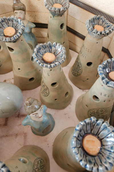 Der erste Brand (Schrühbrand) erfolgt bei 950 Grad und dauert etwa 24 Stunden. Danach räume ich den Ofen aus und reinige die Objekte mit Wasser, um den entstandenen Staub zu entfernen. Dann geht es ans Glasieren. Jede Glasur wird von Hand mit einem Pinsel in zwei Schichten aufgetragen. Anschließend reinige ich die Stellflächen, damit die Glasur beim nächsten Brand nicht an der Ofenplatte festbrennt.