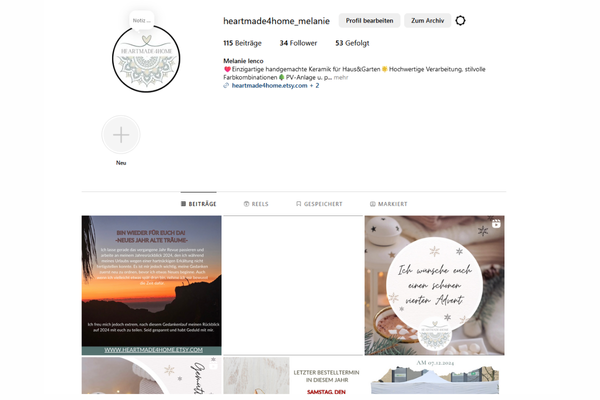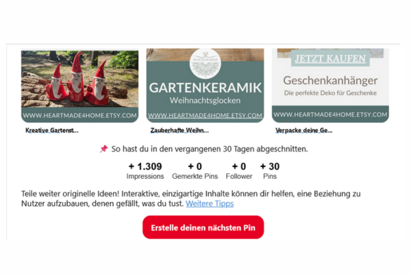 Ich bin unglaublich dankbar für die kleinen, aber bedeutenden Erfolge: Immerhin konnte ich in diesem Jahr 22 Verkäufe über meinen Etsy-Shop, 3 Auftragsarbeiten sowie beim Mössinger Weihnachtsmarkt 2024 rund 500,00 € generieren und damit das Vertrauen meiner Kund:innen gewinnen. Es scheint, als wären alle Käufer:innen zufrieden, denn es gab weder Reklamationen noch schlechte Bewertungen. Das erfüllt mich mit Stolz und motiviert mich, weiterzumachen. 9 Personen folgen meinem Etsy-Shop schon, 108 Artikel wurden favorisiert. Außerdem folgen mir bereits 34 wunderbare Menschen auf Instagram – und davon sind nur drei aus meiner Verwandtschaft😉. Und bei Pinterest habe ich rund 1.300 Impressionen pro Monat. Ein großes Dankeschön an alle, die mir ihr Vertrauen schenken, mich unterstützen und mit ihren Likes und Kommentaren motivieren, das erwärmt mein Herz und motiviert mich!